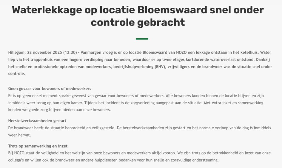 Hillegom, 28 november 2025 (12:30) – Vanmorgen vroeg is er op locatie Bloemswaard van HOZO een lekkage ontstaan in het ketelhuis. Water liep via het trappenhuis van een hogere verdieping naar beneden, waardoor er op twee etages kortdurende wateroverlast ontstond. Dankzij het snelle en professionele optreden van medewerkers, bedrijfshulpverlening (BHV), vrijwilligers en de brandweer was de situatie snel onder controle.